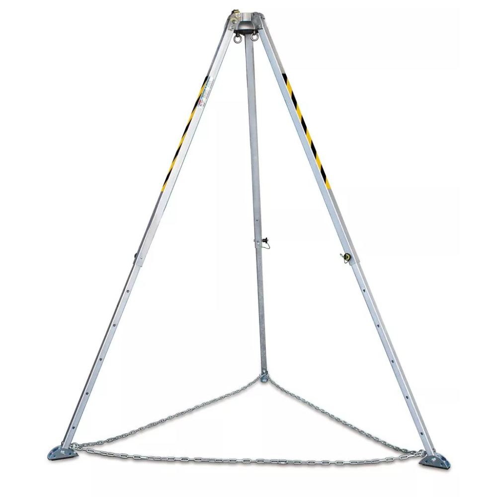 Tripé confeccionado em alumínio leve e resistente, com altura regulável de 1,35 m a 2,40 m e diâmetro de abertura de 1,14 m a 2,10 m. Possui pés antiderrapantes com regulagem independente, corrente limitadora e dois pontos de ancoragem superiores, garantindo estabilidade e segurança em qualquer terreno.