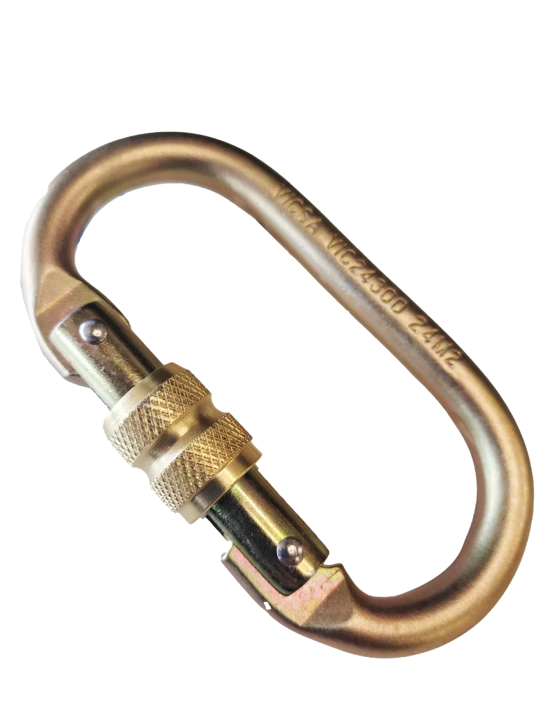 Mosquetão oval de segurança confeccionado em aço forjado de alta resistência, com abertura de 17 mm, trava dupla e fechamento em rosca, assegurando conexões firmes e seguras.