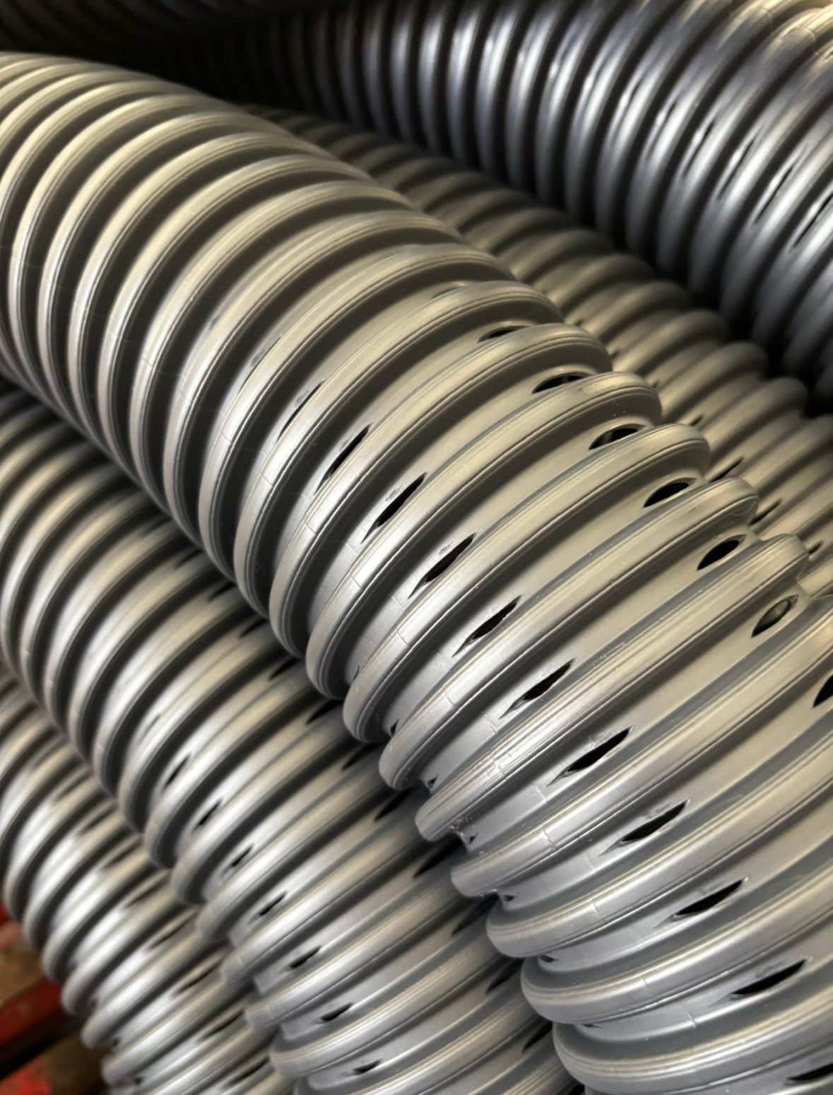 Seu design corrugado confere maior robustez contra cargas de solo, enquanto as perfurações permitem a coleta e condução eficiente do excesso de água, reduzindo riscos de encharcamento, erosão e instabilidade do terreno.